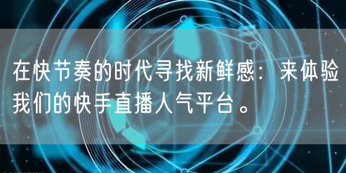 在这个日新月异的时代,我们每个人都身处快节奏的生活节奏之中,繁忙的工作和生活中,我们总是在寻找一些新鲜感来打破常规。而今,随着科技的快速发展,直播行业应运而生,成为我们寻找新鲜感的新天地。今天,我要向大家介绍的是一款能够让你在快节奏时代中探索新鲜感的平台——我们的快手直播人气平台。